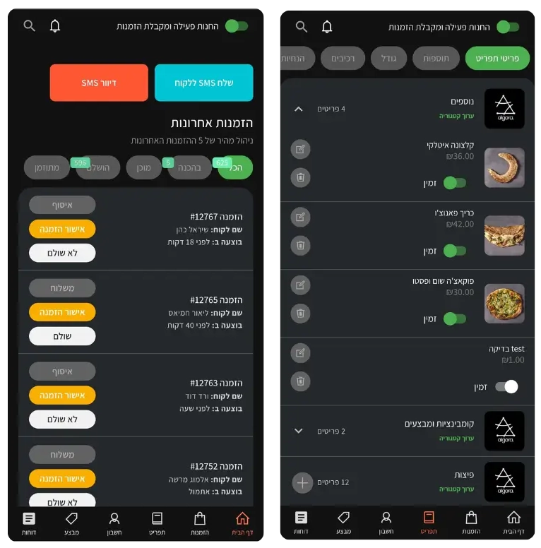 במידה ובחרת לבנות אתר הזמנות למסעדה ולא רק תפריט דיגיטלי או אתר תדמית – תקבל גישה למערכת הניהול שלנו שתותקן על טאבלט ייעודי עבור המסעדה ודרכו אתה או עובדי המסעדה תוכלו לקבל את ההזמנות, לנהל אותן – כמו כן את כל תפריט המסעדה, המידע, דוחות ונתונים ועוד.